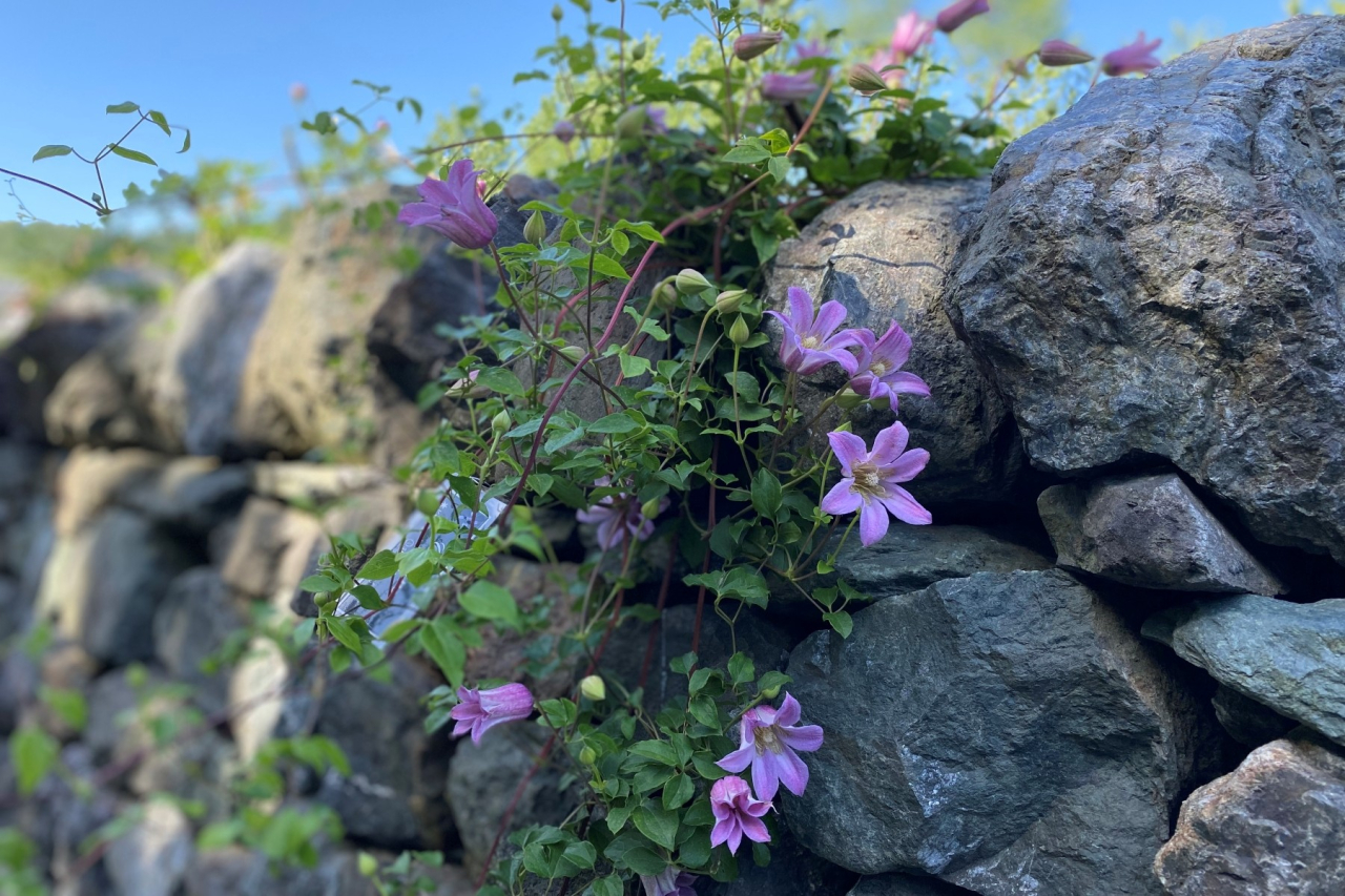 バラのエリアを造る時に、ドライストーンウォーリングで囲むのがオーナーの絶対条件でした。英国でライセンスを取得された職人さんに依頼し、石はヨークシャーストーンではなく当園に合うように徳島の青石を積んでいただきました。
