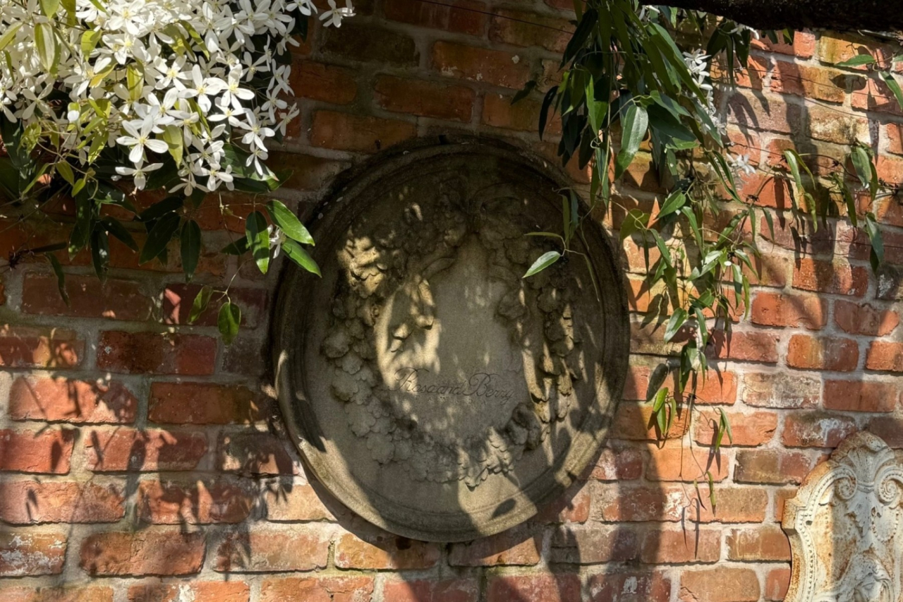 マナーハウスの建設時に見つかった愛くるしいお地蔵さまです。桜並木に向かう池のほとりで、ガーデンを見守ってくださっています。
