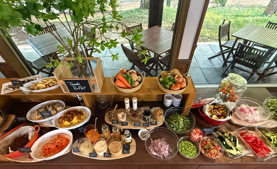 ローザンベリーのメリー畑で採れた新鮮な野菜や、地元食材も使用したヘルシーで安心な手作りデリを楽しめるビュッフェ。