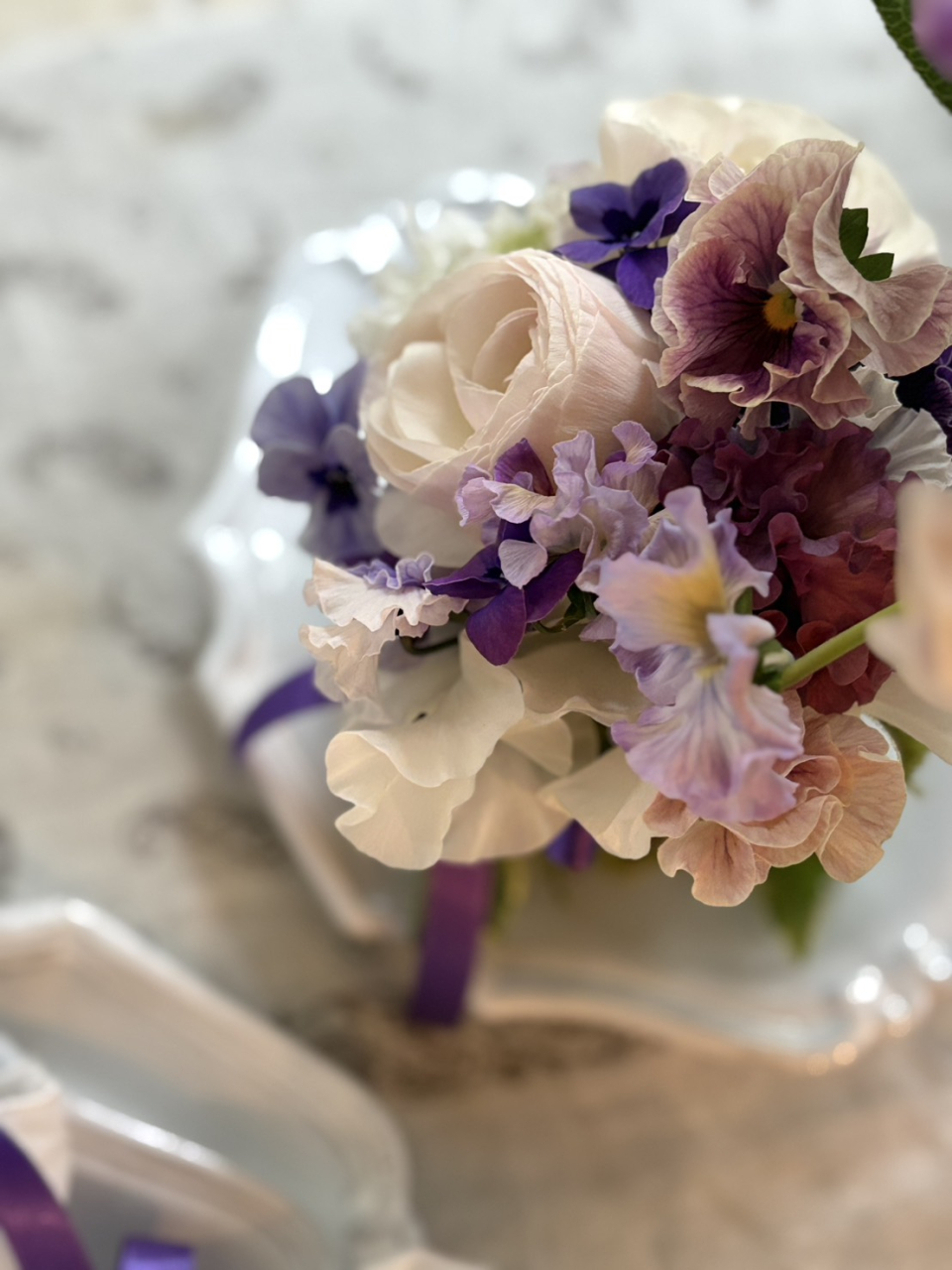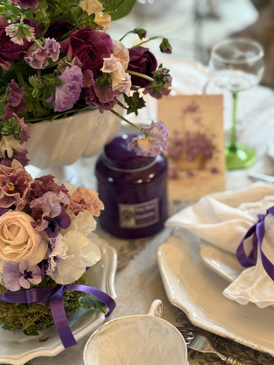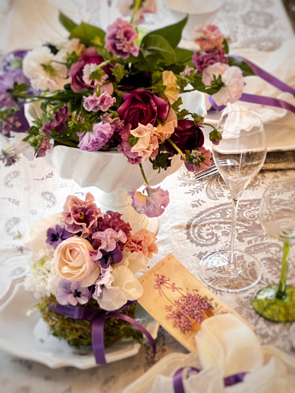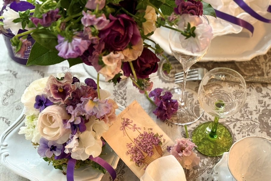 春の訪れを告げるすみれをテーマに、フレンチシックなテーブルコーディネートとお花。