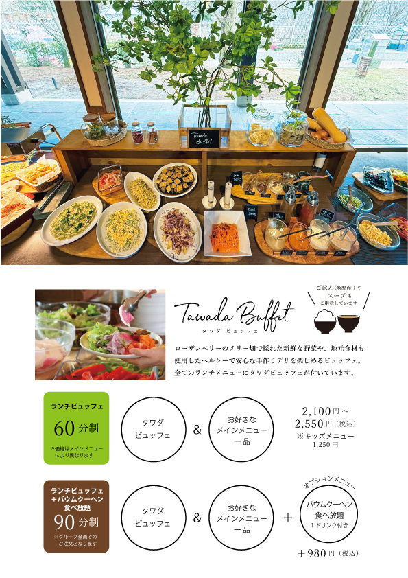 ローザンベリーのメリー畑で採れた新鮮な野菜や、地元食材も使用したヘルシーで安心な手作りデリを楽しめるビュッフェ。