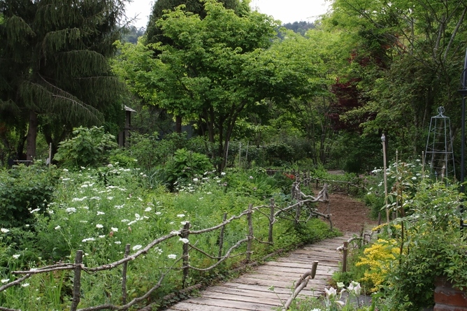 メインガーデンではオルレアが咲き出してます 木の柵とお似合いです
