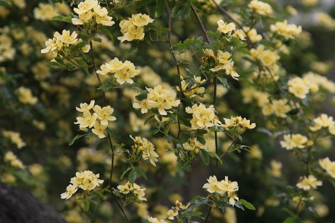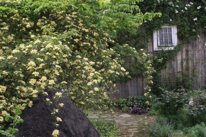 キッチンガーデン入口で咲く中国モッコウバラ(黄色の一重)が満開です