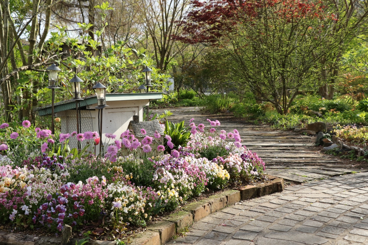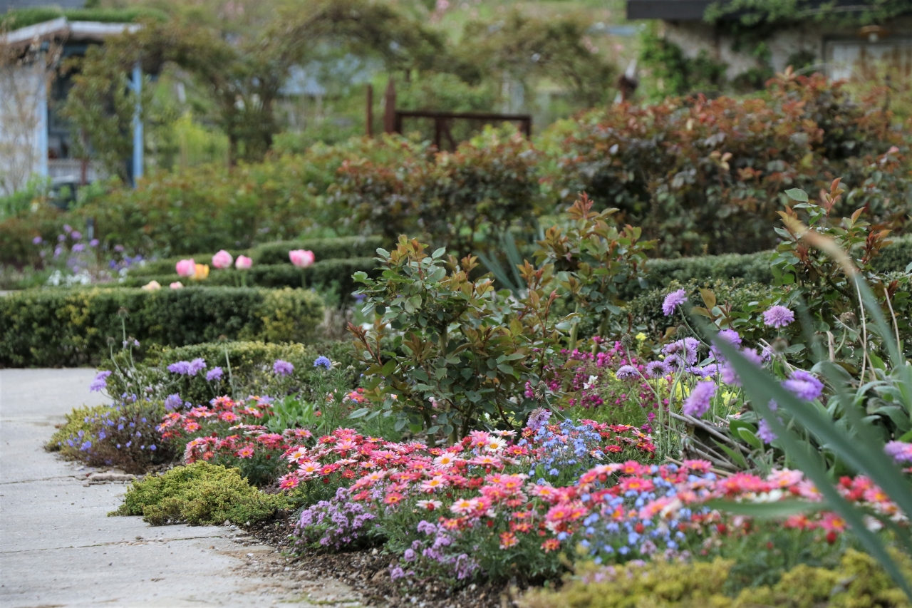キッチンガーデン入り口付近、色とりどりのチューリップが満開になって一気に華やかになってきました