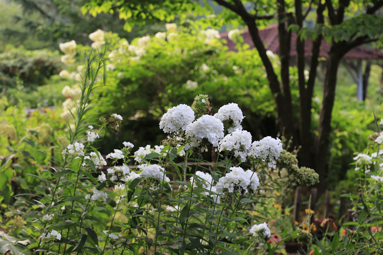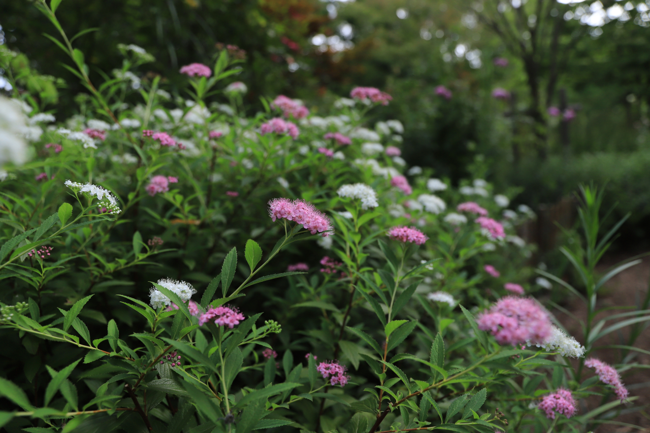 こちらは山野草の庭のサキワケシモツケ。白とピンクに咲き分けるお花です。