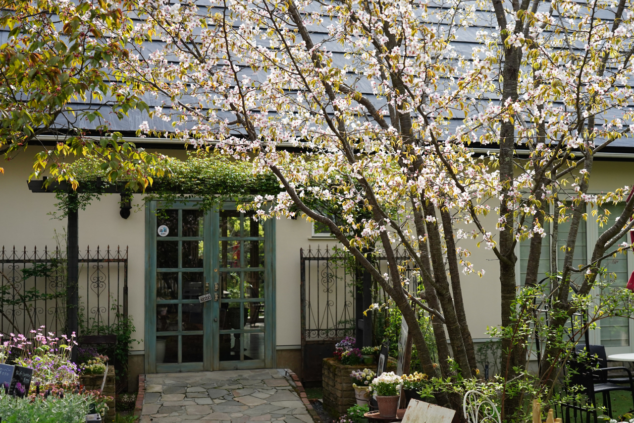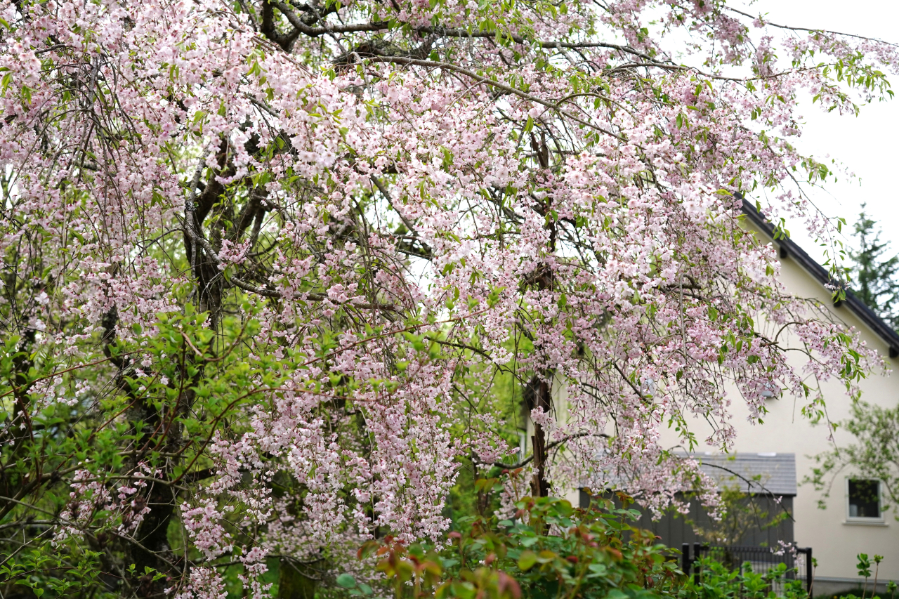 カフェ横のしだれ桜が満開になってます。