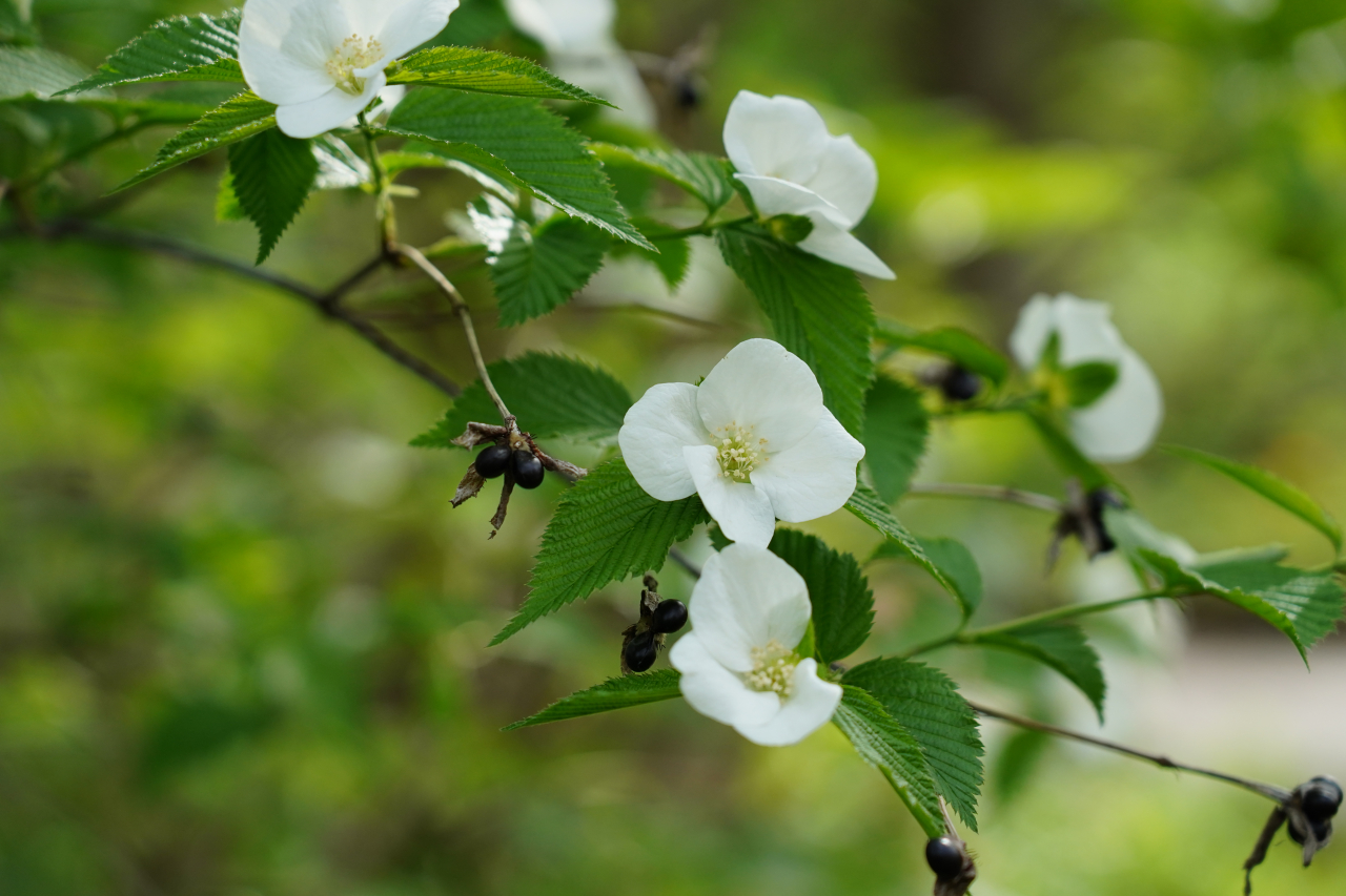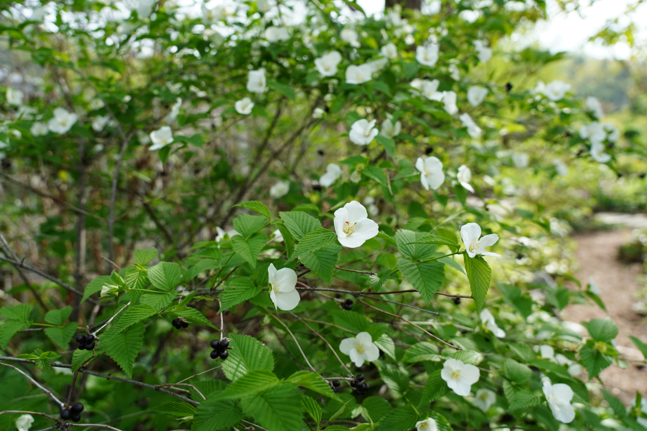 山野草の庭で咲く、シロヤマブキが綺麗