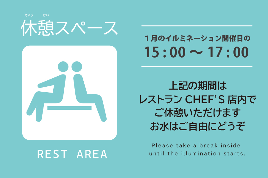 1月10日(土)~12日(月)、17日(土)、18日(日)、24日(土)、25日(日)、31日(土)の8日間、15:00~17:00の時間帯はレストランCHEF'Sを休憩スペースとしてご利用いただけます。