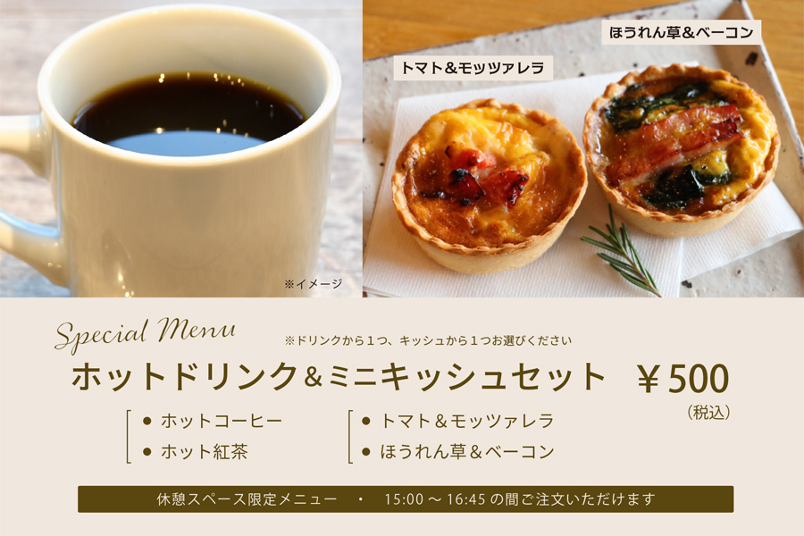 温かいコーヒー(または紅茶)とミニキッシュセットも販売いたします。