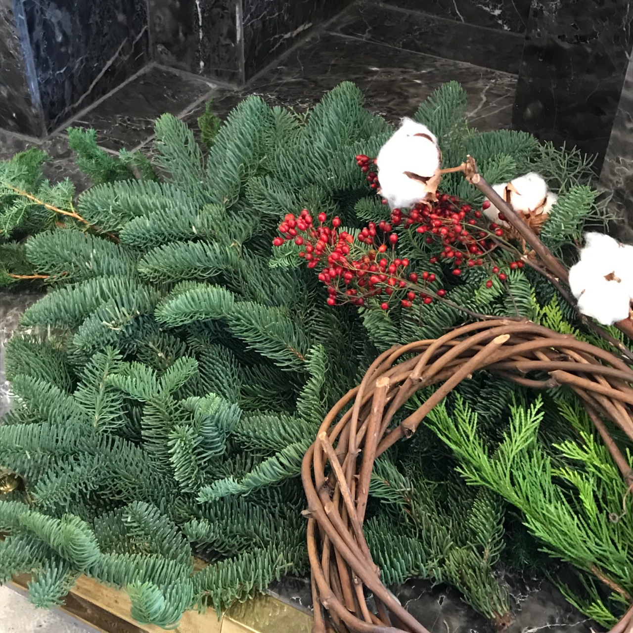 北米から届くモミの木枝とローザンのエバ―グリーンをたっぷり使ったリース。