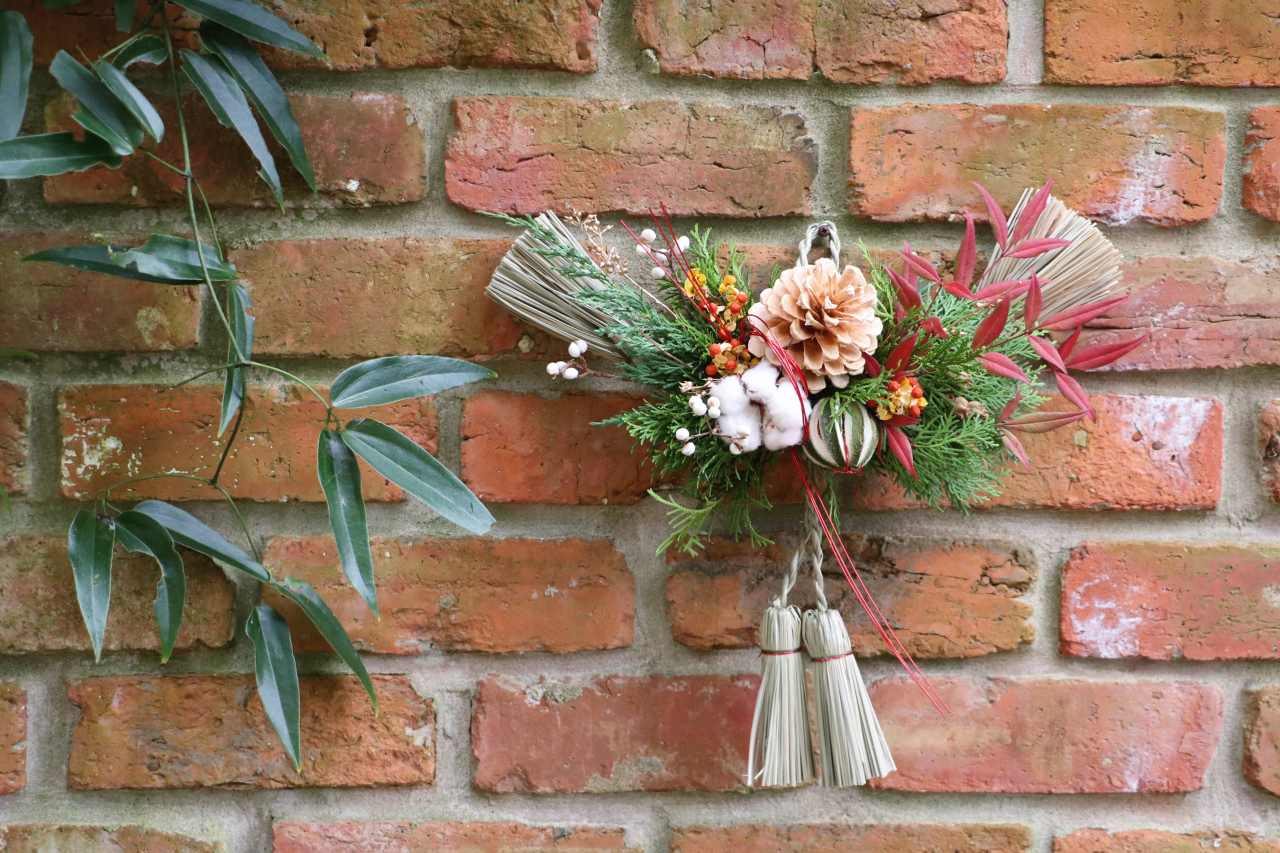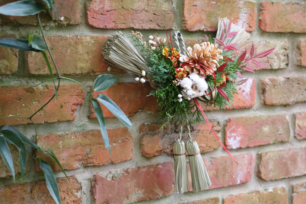今年のお飾りはちょっぴり個性的な注連縄とナチュラル素材で作るお飾りです。