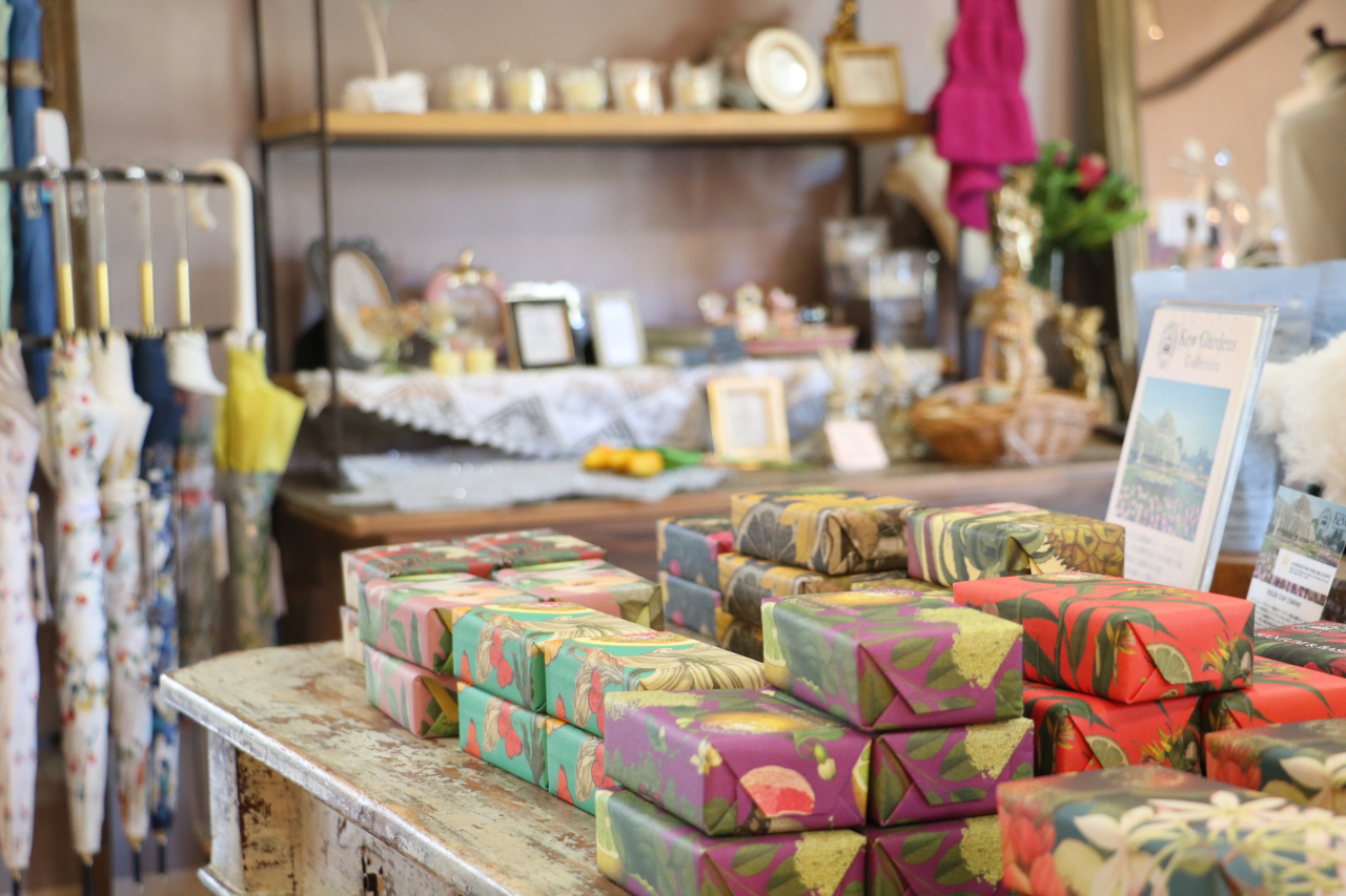 お洒落な植木鉢やガーデニング雑貨、オリジナルレザーエプロンなど、ワクワクする商品が並んでいます。